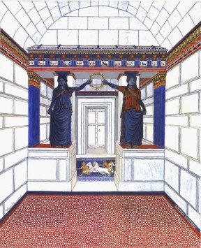 Δημιουργός της εικόνας που βλέπετε, ο ζωγράφος Γεράσιμος Γερολυμάτος. Ο σπουδαίος καλλιτέχνης έφτιαξε την πύλη με τις Καρυάτιδες (;;;)βάσει των χρωμάτων που έχουν βρεθεί στον τάφο και δημοσίευσε την αναπαράστασή του, έτσι όπως ο ίδιος πιστεύει ότι ήταν στην αρχή της κατασκευής της, με όλες τις λεπτομέρειες.