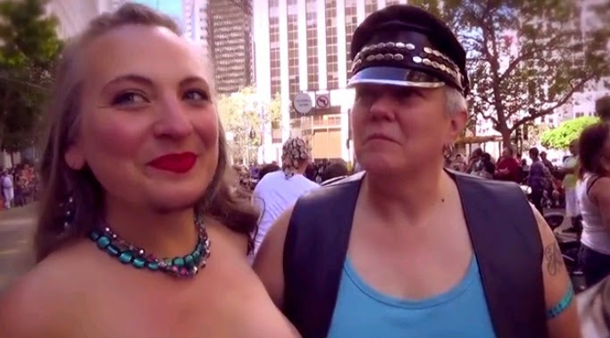 Ζευγάρι Αμερικανίδων ομοφυλόφιλων γυναικών σε “gay parade” που καταλαβαίνετε ποια υποδύεται τον ρόλο του άνδρα (το λένε και οι ίδιες εξάλλου). Η «γυναίκα» πάντως έχει αφήσει λίγο μουσάκι για καλό και για κακό. Το ίδια και στο άλλο ζευγάρι.
