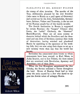 * Ο Wilton, που αναφέρει στο βιβλιο του με λεπτομέρειες την σφαγή των Ρομανώφ στο Αικατερίνμπουργκ (οι δολοφόνοι απόθεσαν τα πτώματα των θυμάτων τους, αφού τα είχαν ακρωτηριάσει, κάψει και περιβρέξει με οξύ καθιστώντας αδύνατη την αναγνώριση της ταυτότητάς τους),επικαλούμενος σοβιετικές πηγές, αναφέρεται και στηνεβραϊκή καταγωγή των 17 από τα 22 μέλη του Συμβουλίου των Λαϊκών Κομισάριων (καλυμμένα τα μη σλαβικά ονόματά τους), των 23 μελών από τα 36 της Cheka (μυστικής αστυνομίας), και των 41 μελών από τα 62 της Κεντρικής Εκτελεστικής Επιτροπής. Ο Wilton δεν ήταν το μόνο ενημερωμένο άτομο που έκανε τέτοιες δηλώσεις. Ο Winston Churchill, κατόπιν Υπουργός πολέμου και αέρα της Βρετανίας, προειδοποίησε επίσης ότι το νέο καθεστώς στη Μόσχα ήταν σε μεγάλο βαθμό η δημιουργία «διεθνών και ως επί το πλείστον αθεϊστών Εβραίων». Αρκετοί δυτικοί πρεσβευτές της Ρωσίας απηχούσαν παρόμοιες ανησυχίες στις εκθέσεις που έστελναν στις πατρίδες τους.