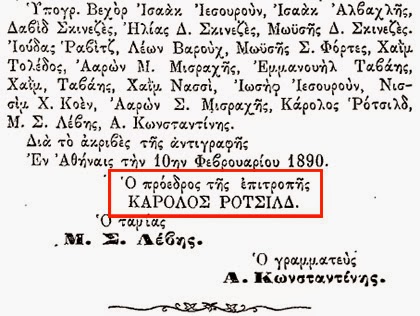 Πρόεδρος Κάρολος Ρότσιλντ. Για να δούμε και κάποια ακόμη στοιχεία από το Κεντρικό Ισραηλιτικό Συμβούλιο (Κ.Ι.Σ.) για την γνωστή Τραπεζιτική οικογένεια των Ρότσιλντ και την παρουσία τους στην Ελλάδα:Μετά το 1834, και την ανακύρηξη της Αθήνας ως πρωτεύουσα της ανεξάρτητης Ελλάδας, αναπτύχθηκε μία μικρή εβραϊκή κοινότητα.Αριθμός εβραϊκών οικογενειών από τη Γερμανία ήρθαν και εγκαταστάθηκαν στην Αθήνα.Μεταξύ αυτών και ο χρηματιστής Μαξ ντε Ρότσιλντ, ο οποίος συμμετείχε στην ακολουθία του βασιλιά Όθωνα. Μέσω της Δουκίσσης της Πλακεντίας αποκτήθηκε μια μεγάλη έκταση για την ανέγερση της Συναγωγής (1843).