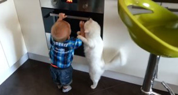 Ένα αγοράκι και μια γάτα βρίσκονται στην κουζίνα. Ο μικρός δείχνει ενδιαφέρον να εξερευνήσει την αναμμένη κουζίνα και αρχίζει να ανοιγοκλείνει κουμπιά και να προσπαθεί να ανοίξει τον φούρνο. Η γάτα δίπλα του παρατηρεί τις κινήσεις του. Μόλις βλέπει ότι ο μικρός πιάνει τη λαβή του φούρνου με τα ποδαράκια της του σπρώχνει τα χέρια από τον φούρνο, δείχνοντάς του με τον τρόπο της ότι εκεί υπάρχει κίνδυνος.
