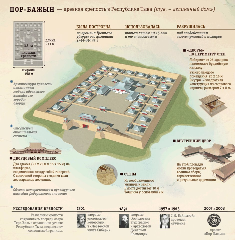 Το όνομα Por-Bajin μεταφράζεται ως “σπίτι από πηλό” και βρίσκεται 3800 χιλιόμετρα από τη Μόσχα. Ανακαλύφθηκε το 1891 και ενώ με τη πρώτη ματιά μοιάζει με φρούριο, λόγω των πανύψηλων τειχών, μάλλον δεν είναι αυτό που φαίνεται. Οι ειδικοί πιστεύουν ότι το κατασκεύασμα περιέχει ένα θερινό ανάκτορο και ένα μοναστήρι. Αλλά κανείς δεν είναι σε θέση να το αποδείξει.
