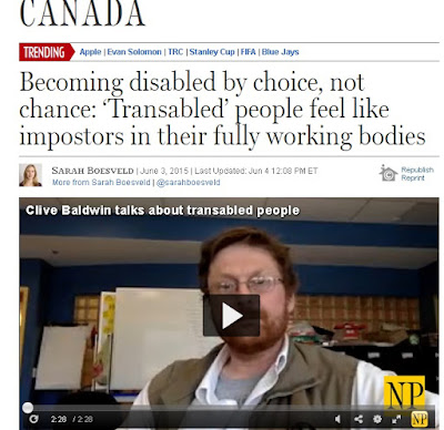 Ενόψει του επικείμενου Κογκρέσου των Ανθρωπιστικών και Κοινωνικών Επιστημών, (Congress of the Humanities and Social Sciences), η καναδική εφημερίδα National Post δημοσίευσε ένα άρθρο σχετικά με τα “transabled” άτομα, τα άτομα που αναγνωρίζουν τους εαυτούς τους ως άτομα με ειδικές ανάγκες, ακόμη και αν δεν υπάρχει τίποτα λάθος με αυτούς.