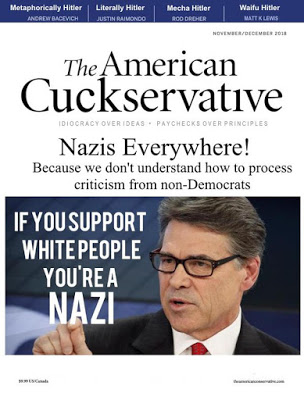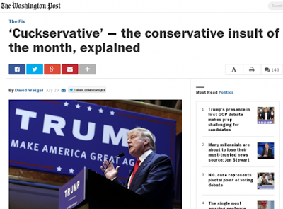 Και να που ο όρος cuckservative ξαφνικά βρίσκεται παντού, δημιουργώντας αμηχανία και φαγούρα στους λίμπεραλς/αριστερούς. Είναι τολμηρός, πνευματώδης και αποτελεσματικός, καθώς το μήνυμα είναι σύντομο και απλό. Ως εμπνευστές του όρου κατηγορούνται οι «Λευκοί ρατσιστές».