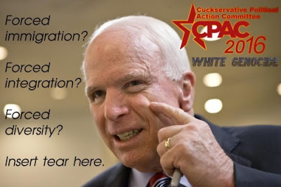 Φυσικά κάποιοι cucks να αποκαλούν τους εαυτούς τους «συντηρητικούς». Υπάρχει κάτι εξαιρετικά αποκρουστικό για τους αυτοαποκαλούμενους συντηρητικούς πολιτικούς και προσωπικότητες των media που ανυπόμονα ξεπουλάνε τα αναφαίρετα δικαιώματα του λαού τους, μιλώντας για αρχές όπως «Σύνταγμα», «περιορισμένη κυβέρνηση», «ελεύθερη αγορά» και «αξιοκρατία», ενθαρρύνοντας παράλληλα την μαζική μετανάστευση των μη λευκών οι οποίοι δεν νοιάζονται για αυτές τις αρχές. Θα ακούσετε τον cuckservative Sean Hannity να θέτει τα κριτήριά του για το ρεπουμπλικάνο προεδρικό υποψήφιο: κάποιος που θα εξισορροπήσει τον προϋπολογισμό, θα ασφαλίσει τα σύνορα, θα αναλάβει δράση κατά του «ριζοσπαστικού Ισλάμ» [τα εκατομμύρια των μη-φανατικών μουσουλμάνων είναι μια χαρά] , να καταργήσει το Obamacare, να αντιταχθεί στη συνθήκη με το Ιράν, και ανεγείρει ένα μόνιμο ιερό στον Βενιαμίν Νετανιάχου στο Washington Mall τουλάχιστον τόσο εντυπωσιακό όσο και το Μνημείο Λίνκολν.