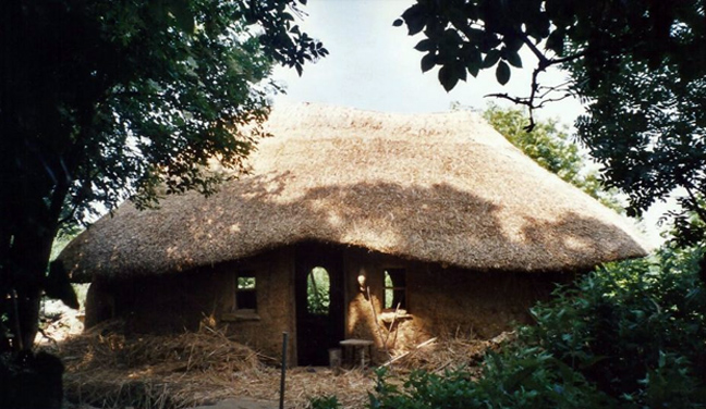 Η οροφή βασίζεται σε ένα ξύλινο πλέγμα και καλύπτεται από άχυρο από τα χωράφια του Buck. Το σπίτι δεν διαθέτει προφανώς κεντρική θέρμανση αλλά αυτός ο τρόπος κατασκευής προσφέρει εξαιρετική μόνωση ενώ το ταβάνι είναι ενισχυμένο και με μαλλί προβάτου για να κρατά ακόμα καλύτερα τη ζέστη.