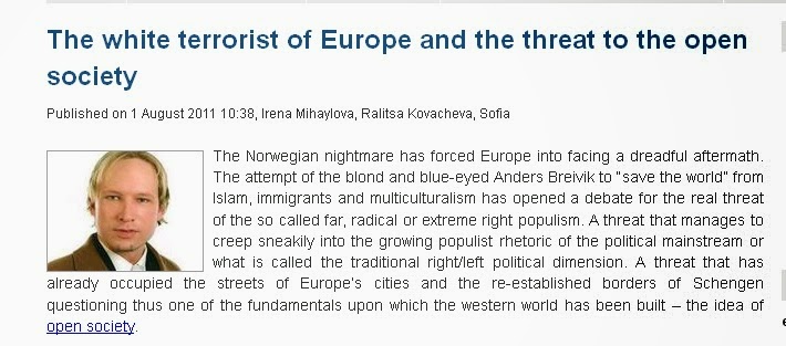 Βεβαίως η στάση όλων αυτών των πολύ προσεκτικών «ειδημόνων» αλλάζει ραγδαία, όταν εμφανισθεί κάποιος.. Μπρέιβικ. Εκεί, το κακό δεν είναι «τυχαίο», δεν φταίει ένας «τρελός», ένας μεμονωμένος, ή κάποια ομάδα που τα έχει λίγο «παρερμηνεύσει» τα πράγματα, αλλά γίνεται συστηματική προσπάθεια να συνδεθεί η εγκληματική ή τρομοκρατική πράξη ενός ανθρώπου ή μιας ομάδας, με ολόκληρο τον «χώρο», που μπορεί να είναι γενικά οι «νεοναζί» ή γενικότερα οι «(λευκοί) ρατσιστές» ή ακόμα πιο γενικότερα οι «εθνικιστές». Και από εκεί και πέρα ξεκινά να δουλεύει ασταμάτητα η μηχανή της προπαγάνδας, προσπαθώντας να πείσει τον κόσμο ότι η μόνη λύση για «να σωθεί η κοινωνία» από τον εθνικισμό “που γεννά εγκληματίες”, είναι ο «αντιρατσισμός», τουτέστιν η φίμωση και η καταστολή με κάθε τρόπο, όσων αντιτίθενται στις πολυπολιτισμικές κοινωνίες, μέσα στις οποίες βέβαια, (και γιατί να το κρύψωμεν άλλωστε) καιροφυλακτούν οι επόμενοι κεφαλοκόφτες!!