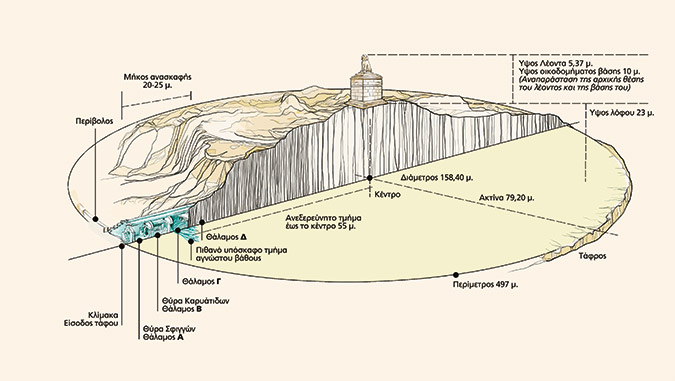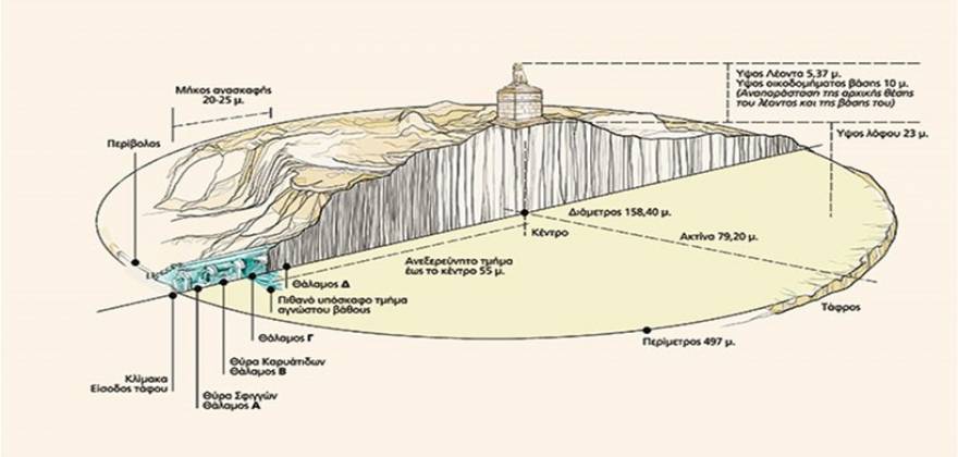 Για τις γιγαντιαίες, επιβλητικές αναλογίες του τύμβου, τα 23 μέτρα που έχουν αποκαλυφθεί έως σήμερα ορίζουν «απλώς» έναν μακρύ ταφικό δίαυλο. Ως το κέντρο του λόφου απομένουν περισσότερα από 50 μέτρα ανασκαφής – και εκπλήξεων. Ιδίως αν το μνημείο αρχίζει να διαιρείται σε υποθαλάμους, προχωρώντας ταυτόχρονα βαθύτερα στο έδαφος.