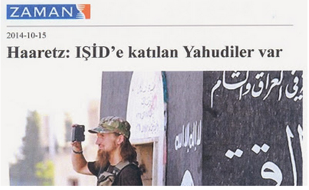 Την πραγματικά καταπληκτική είδηση που δείχνει και την μεγάλη υποκρισία στον πόλεμο που έχουν ανοίξει εδώ και καιρό οι Τζιχαντιστές ότι Εβραίοι βρίσκονται στις τάξεις τους και μάλιστα μετέχουν ενεργά στις πολεμικές επιχειρήσεις των φανατικών μουσουλμάνων, αποκαλύπτει η πρώτη σε κυκλοφορία τουρκική εφημερίδα, Zaman, η οποία μάλιστα επικαλείται σχετικό δημοσίευμα της ίδιας της γνωστής ισραηλινής εφημερίδας, Haaretz.
